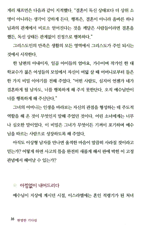 제목과 본문에서 반복하는 ‘기다림’이라는 표현이 싱글 여성들에게 고통스럽게 들릴 것을 안다. 남의 속도 모르고 무작정 기다리라는 말처럼 들려서 답답할 수도 있다. 하지만 기다림에는 반드시 끝이 있다. 기다리되, 적극적으로 기다리라! 가장 적극적인 기다림은 분주한 남자사냥꾼이 되는 것이 아니라, 하나님을 기다리며 당신을 여성으로 지으신 하나님의 마음에 합한 여성으로 준비되는 것이다. 이것이 미혼이나 기혼, 이혼, 사별이라는 당신의 현재 상태와 상관없이 행복할 수 있는 유일한 길이다. 이 진리를 붙잡으라!