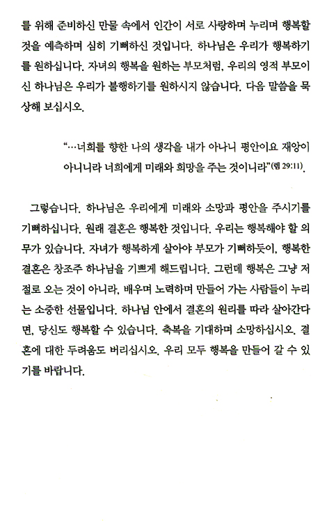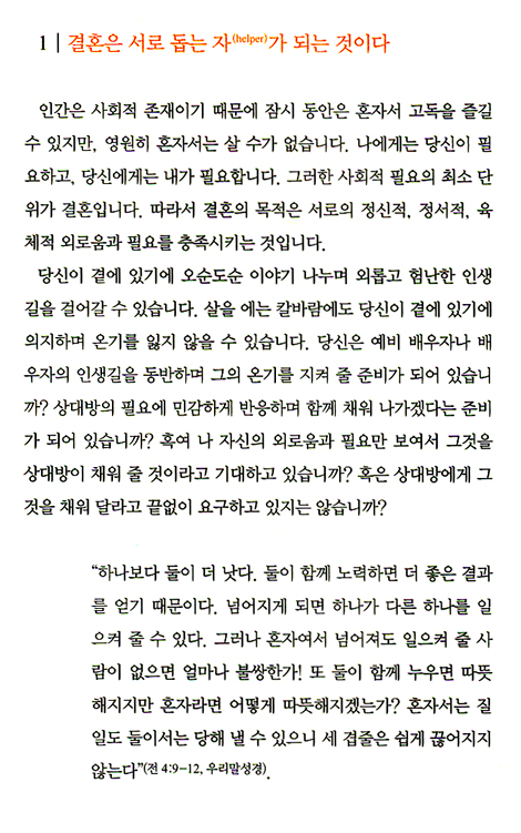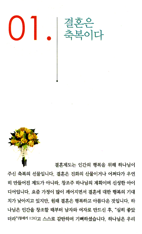 사람의 인생에서 가장 중요한 것을 꼽으라면 단연 ‘결혼’일 것이다. 결혼은 인생의 꽃이고, 진정한 어른이 되기 위해 입학하는 하나님의 학교다. 결혼은 인간이 만든 제도가 아니라 하나님이 만드셨다. 하나님은 결혼을 통해 인간을 그리스도의 장성한 분량에 이르도록 위로하고 격려하고 훈련하신다. 때문에 사탄은 호시탐탐 결혼을 소중하게 여기지 않도록 우리 마음을 조종한다. 결혼을 하지 않은 사람에게는 ‘결혼? 귀찮게 뭐 하러 해, 혼자 즐기며 살다 가면 되지’ 하는 마음을 갖게 하고, 결혼한 이들에게는 ‘뭐 하러 참고 살아. 이혼한다고 내 한 몸 못 먹고 살겠어?’ 하는 마음을 갖게 한다. 이처럼 결혼이 오염되고 훼손된 가장 큰 이유는 결혼에 대해 알지 못하기 때문이다. 사회에 나와서 거의 사용하지 못하는 대학입시 공부는 밤새도록 코피 터져라 하면서 가장 중요한 결혼에 대해서는 변하기 쉬운 감정에만 의존해서 하다보니 당연히 부작용이 생길 수밖에 없다.