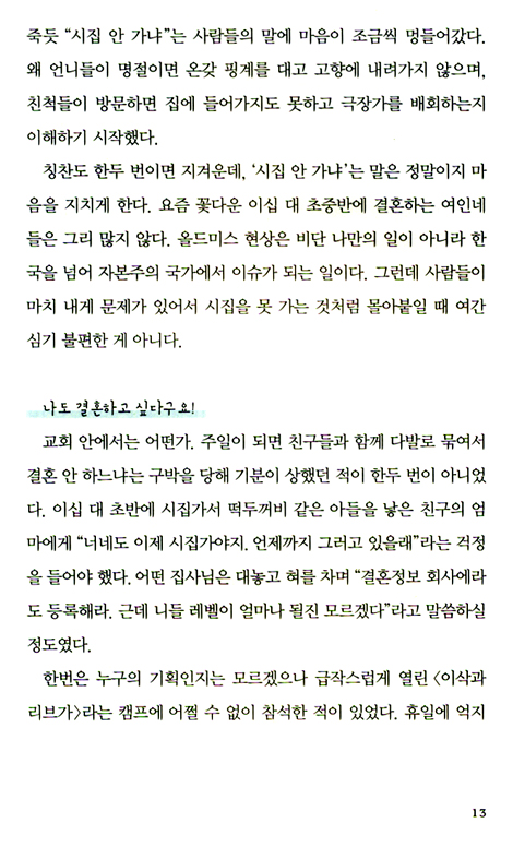 교회 사역으로 인해 청춘의 시간을 다 바쳤는데, 결국 30대 후반이 될 때까지 결혼하지 못해 자존감에 상처를 입은 인생들이 많다. ‘사역’은 모두의 임무였지만 ‘결혼’은 결국 공동체가 도와주지 않는 개인적 문제로 남은 것이다. 완벽한 남자가 하늘에서 뚝 떨어지기만을 기다리는 그녀들의 사고방식에도 문제가 있지만, 그들의 결혼문제가 심각한 줄 알면서도 별다른 해결책을 내지 않고 나 몰라라 하는 교회의 책임도 있다는 것이다.