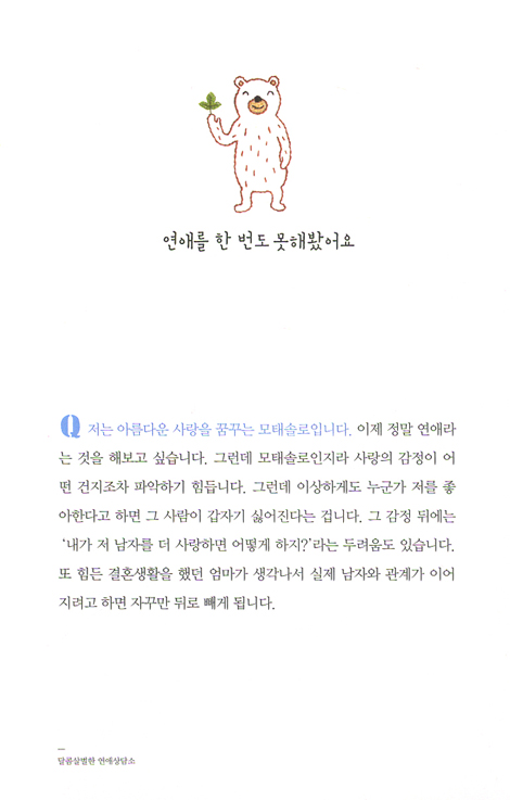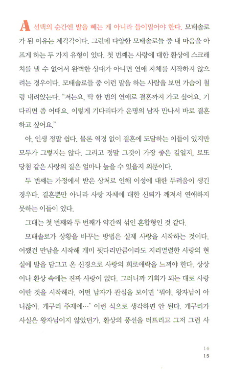 모태솔로가 상황을 바꾸는 방법은 실제로 사랑을 시작하는 것이다. 개미 뒷다리만큼이라도 지리멸렬한 사랑의 현실에 발을 담구고 온 신경으로 사랑의 희로애락을 느껴야 한다. 상상이나 환상 속에는 진짜 사랑이 없다. 기회가 되는 대로 사랑이란 것을 시작해라. 어떤 남자가 관심을 보이면 ‘뭐야, 왕자님이 아니잖아? 개구리 주제에…’ 이런 식으로 생각하면 안 된다. 개구리가 사실은 왕자님이지 않았던가.(15쪽)
