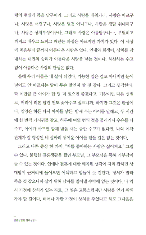 아무래도 결혼하면 짝꿍이 생기고 귀여운 아기도 생기니 싱글 때의 외로움과는 성격이 달라진다. 그러나 덜 외로워지는 대신 더 괴로워진다고나 할까. 열심히 서로를 사랑하는 부부는 대개 상당히 괴로운 시간을 보낸다. 그러니 결혼이 외로움을 해결해줄 것이라는 막연한 기대를 버리고 지금 이곳에서 당신의 외로움을 대면해 잘 다루는 연습을 하기 바란다. 내가 누군가를 외로움에서 완전히 구해줄 수 없듯이 상대도 그렇다. 외로움은 꼭 나쁜 것만은 아니다. 생각과 창조의 에너지가 되기도 하고, 인간에겐 사랑이 필요한 존재라는 사실을 인지시켜 주기도 한다. 그러니 때때로 외로움의 손을 잡고 걷는 것도 나쁘지 않다.(147쪽)