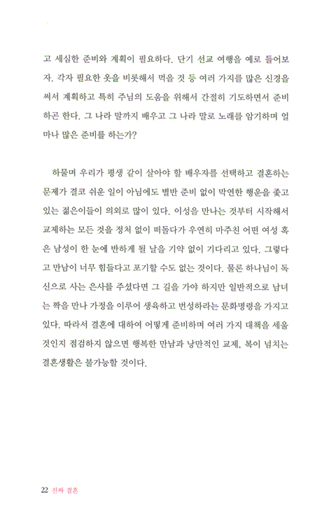 건강한 가정들을 만들어 가는 것은 우리들이 마땅히 해야 할 일이다. 결혼을 했다는 것은 많은 책임과 의무가 따른다. 서로 다른 남녀가 결혼이라는 울타리에서 성경대로 살아가는 방법을 배우면서 성숙한 그리스도인들이 되어가는 것이다. 결혼했다고 저절로 행복해 지는 것이 아니다. 서로가 노력하며 하나님의 말씀에 순종하는 일이 없으면 결코 행복해질 수 없다.