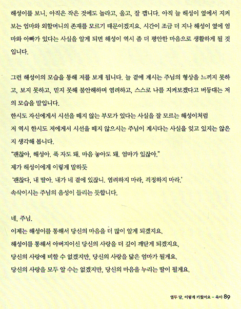 우리 아이들이 결혼을 하고 임신을 하면 이 책을 선물하고 싶다. 사모님이 좋은 마음으로 촬영한 좋은 세상을 미리 보여 주고 싶다. 기쁜 마음으로 이 책을 추천한다. 분명 이 책을 읽는 분들 마음으로도 김기정 사모님의 좋은 마음이 전해질 것이다.