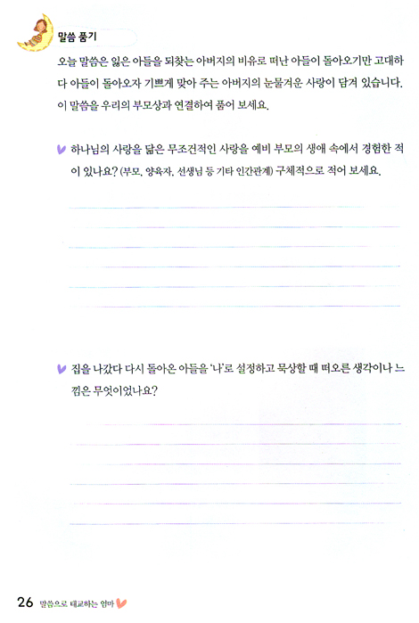 “하나님! 제가 하나님의 사랑과 지혜와 능력을 힘입게 하소서. 제가 하나님 닮은 부모가 되도록 도와주세요.”