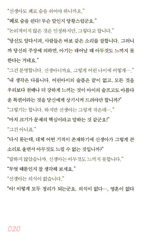 프레드릭 르봐이예는 책에서 마치 자신이 신생아인 것처럼 말한다. 언어에 천재적이다. 내가 분만하는 여성이자, 동시에 태어나는 아기인 것 같은 느낌을 받았다! 대단한 발견이었다! 분만하고 태어나는 것이 다르지 않다니! 아기를 출산하는 여성이 자기가 태어났던 순간과 조우한다! 하나밖에 없는 같은 문을 통해 우리는 들어가고, 나온다. 이 책은 삶이라는 완전히 신비로운 영역에 한줄기 빛을 비추기 때문에 내게 경전이 되었다. 그래서 고전이 되었다.