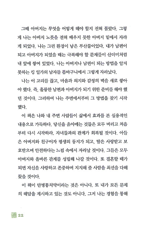 저자는 삶에서 경험한 다양한 사례를 들어가며 아버지 되는 법을 이해하기 쉽게 설명하고 있다.