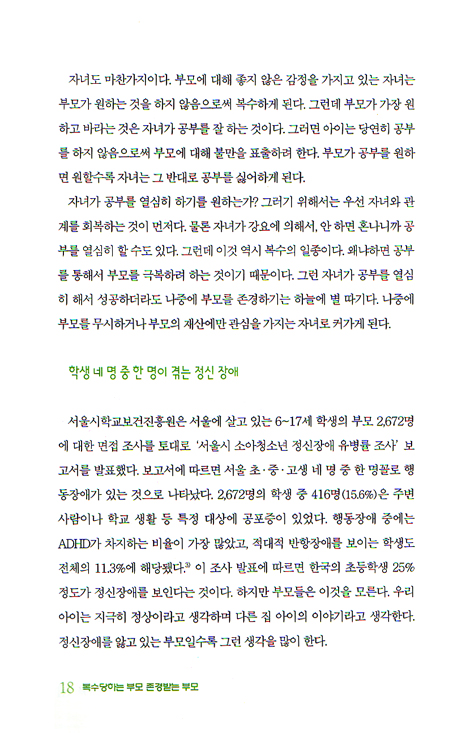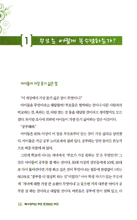 한국의 자녀교육은 한마디로 부모는 부모로서 힘들고, 자녀는 자녀대로 힘들고, 그러면서 결과는 엉뚱한 것이 특징이다. 부모들은 자녀를 너무나 사랑하고 자녀를 위해 온몸 바쳐 희생한다. 자녀에게 너무나 열심이다. 그런데 자녀는 자녀대로 너무 힘들다. 공부에 치이고, 학원에 지치고, 부모 잔소리에 불만이다. 먹을 것 못 먹고, 입을 것 못 입고 자녀를 위해 희생했는데 자녀는 그런 부모에 대해 불만이고 나중에 자녀가 성공했더라도 부모를 존경하지 않고 무시한다.