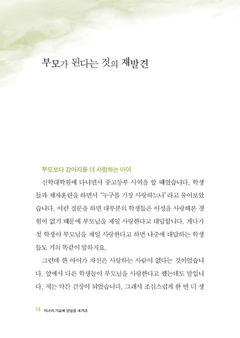 이 책의 초고를 먼저 읽어보니, 어린 자녀를 하나님의 뜻대로 키우고자 하는 모든 부모들과 미래를 준비하는 모든 목회자들과 신학생들, 나아가 결혼을 준비하는 모든 크리스천 청년들이 꼭 읽어야 하겠고, 꼭 읽히고 싶은 마음이 간절합니다.
