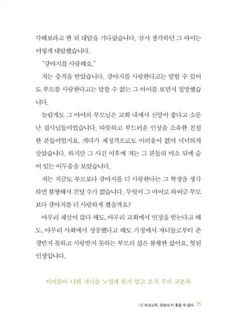 하나님께서는 부모가 먼저 마음에 말씀을 새긴 다음 자녀에게 그 말씀을 부지런히 가르치라고 명령하셨다. 그리고 그것이 ‘자녀를 복 있는 사람으로 키우는 가장 확실한 방법’이라고 약속하셨다(신 6:4~24). 그럼에도 많은 크리스천 부모들이 보암직하고 먹음직한 세상의 방법을 좇아, 옆집 엄마가 하는 대로, 매스컴이 좋다는 대로 따라 하는데 급급하다. 이런 악순환에서 벗어나려면 ‘내 자녀가 아닌 하나님의 자녀’라는 진심 어린 고백이 필요하다. 자녀에게 좋은 것만 주고 싶은 부모의 마음이 곧 우리에게 성경을 주신 하나님의 마음임을 헤아려 말씀이 이끄시는 대로 자녀를 가르칠 수 있기 때문이다.