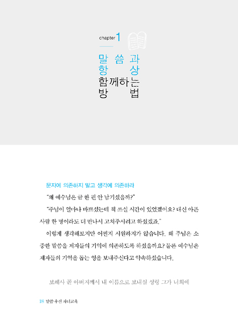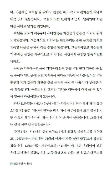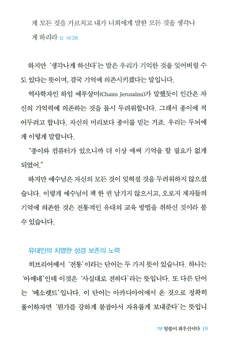 전세계 정치, 경제, 언론, 예술을 움직이고 있는 유대인을 만든 교육은 말씀 우선주의 교육이었다. 이스라엘 교육 전문가인 저자의 말에 따르면 말씀 우선주의 교육의 핵심은 바로 암송이다. 유대 민족은 기록이 아닌 기억을 통해 하나님의 말씀을 일점일획도 빠지지 않고 보존해왔다. 그들은 하나님의 계시를 살을 붙여 이야기로 만들지 않고, 빼지도 않고, 있는 그대로 암송하고 묵상하고 실천했던 것이다. 이를 통하여 그들은 하나님이 말씀을 지켜 행하는 자에게 주신다고 약속하신 복을 누릴 수 있었다.