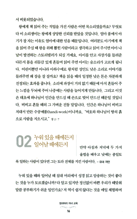 잠자기 전에 어떤 책을 읽어 줄까, 망설이지 말고 성경을 들려주고 말씀을 암송하는 것이 좋다. 노벨상 수상자들의 가정을 연구한 결과 중 하나가 교육의 중요성을 강조하는 종교적 가치관이 크나큰 구실을 했다는 점이다.