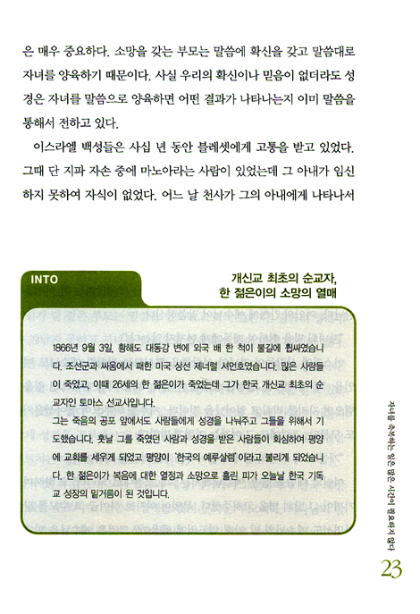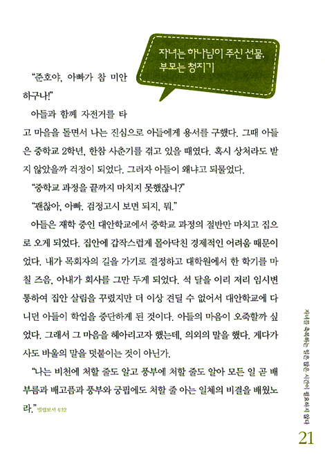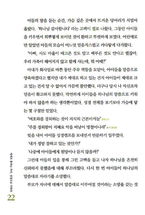 원고를 본 몇몇 분들이 내용대로 실천하고 있다고도 했다. 그랬더니 조금씩 변화되고, 자녀교육은 물론 믿음생활에 새 각오로 도전하게 되었다는 것이다.