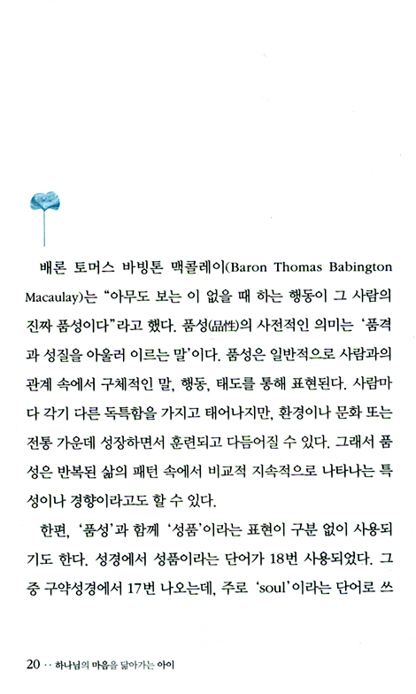 참된 성품 교육은 인간을 성품의 존재로 지으신 하나님께로 돌아가 그분의 가르침에 귀를 기울일 때 비로소 가능한 일이다. 우리 자녀들이 하나님의 마음을 닮아가는 아이로 자라도록 돕는 일, 이것만이 유일한 희망이다. 이 책은 이런 희망을 붙잡게 하는 사막의 오아시스 같은 교과서다. 이 오아시스의 샘물을 마신 자녀들을 통해 우리 시대의 사막이 낙원으로 변화되는 기적을 보고싶다.