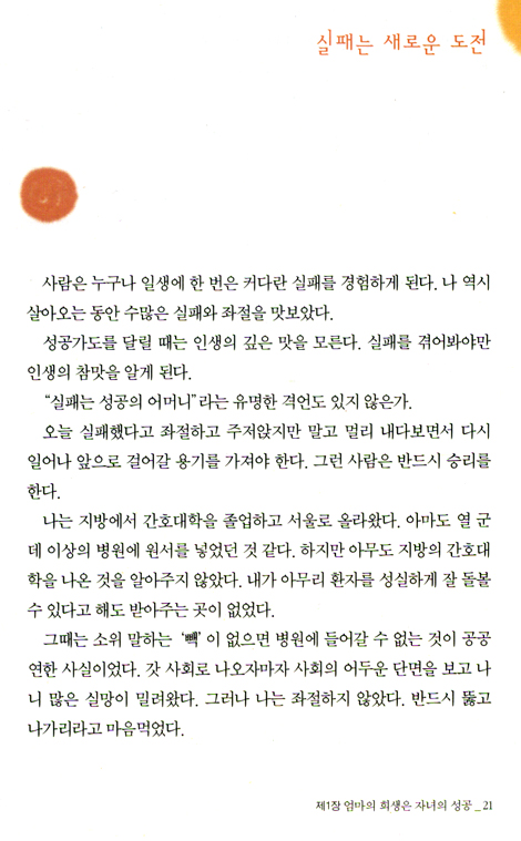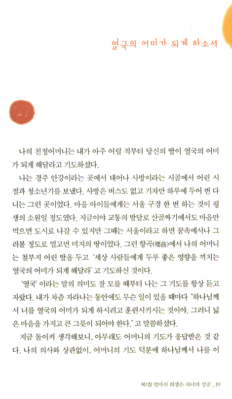 남편 없이 홀 몸으로 먼 미국의 땅에서 세 아이를 키운다는 것은 말로 다할 수 없을 정도로 힘들고 어려운 일이다. 그때마다 어머니는 가장 가까운 친구같이, 또한 가장 훌륭한 기도의 동역자로서 힘을 북돋우며 매일 시편 23편을 100번씩 암송하게 하셨다. 하나님의 말씀과 어머니의 기도가 없었다면 나와 세 자녀는 그 어떤 것도 이루어내지 못했을 것이다. 어릴 때부터 철저하게 훈련시킨 기도와 말씀 중심의 생활은 결핍 가운데에서도 세 아이의 심령을 채워주었고 나아가 세상사람 모두가 놀랄 만한 기적을 일구어냈다. 기억하라. 누구든지 기도의 어머니가 될 수 있다. 누구든지 자녀를 훌륭하게 성장시킬 수 있다.
