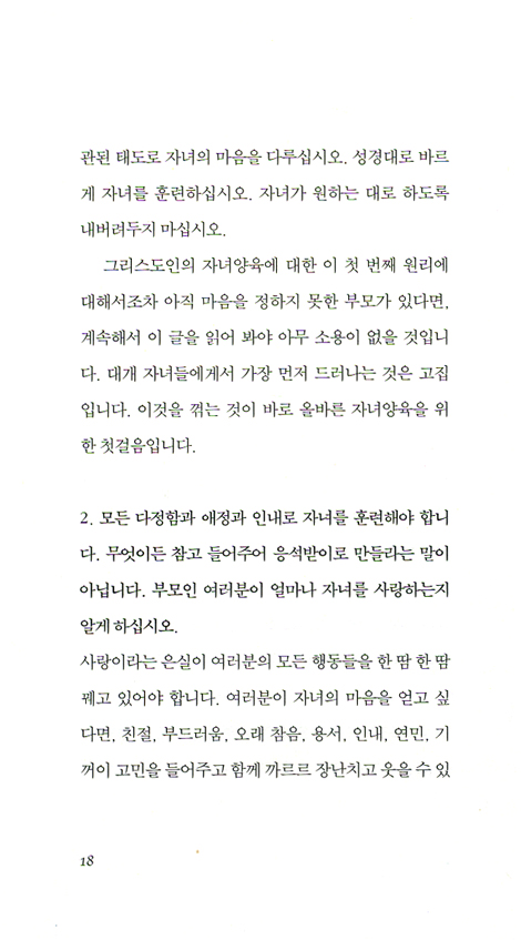 자녀를 훈육하는 데 온유와 사랑만큼 필요한 것은 없습니다. 목사도 예수님처럼 강력하고 확고하고 분명하게 진리를 설파할 수 있습니다. 하지만 사랑으로 전하지 않으면 영혼들을 구원에 이르게 하기는 어렵습니다. 마찬가지로 부모는 자녀들에게 그들이 마땅히 해야 할 의무들을 요구할 수 있습니다. 명령하거나 설득하거나 자녀의 불순종에 체벌하는 등 여러 가지 방법을 사용할 수 있습니다. 하지만 애정이 빠지면 이런 수고는 모두 헛된 것이 되고 맙니다. (p.21)