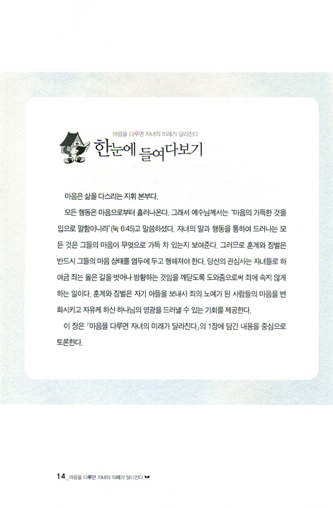 이 책은 단지 「마음을 다루면 자녀의 미래가 달라진다」를 다시 읽고 빈 칸을 채우는 식의 스터디북이 아니다. 그 책이 출판된 이후 5년 동안 테드 트립 박사는 세계 전역에서 수많은 부모들에게 자녀 양육에 대해 가르치는 기회를 가졌다. 그것은 그 주제에 대해 하나님의 말씀을 통찰하는 시간이 되었고, 「마음을 다루면 자녀의 미래가 달라진다」의 내용과 적용의 이해를 보다 넓고 깊게 하는 결과를 낳았다. 이 책은 자녀를 양육하는 도전들에 대한 성경의 의미와 적용들을 풍성하게 담고 있다.