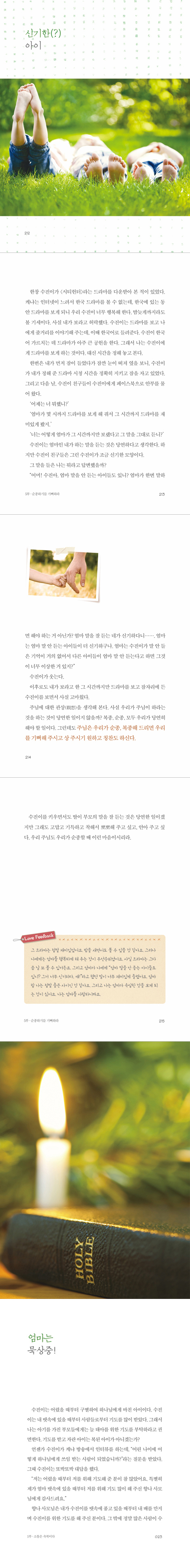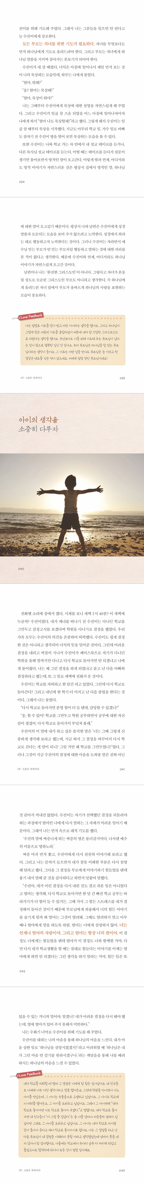 나는 결혼을 하고도 사역을 멈춘 적이 없다. 그러니 아이와 시간을 많이 보내지 못해 늘 마음 깊은 곳에 미안함이 자리하고 있다. ‘양보다는 질’이라는 말처럼 아이와 시간을 많이 보내지 못하더라도 함께 보내는 시간만큼은 알차게 잘 보내면 된다고 생각하면서 스스로 위로도 해 보았다. 그러나 어느 책에서 “스테이크가 아무리 맛있고 고급스럽다 할지라도 배가 고픈 사람에게 자그마한 양만 준다면 그 스테이크가 과연 좋은 것인가?” 하는 비유와 함께 부모가 자식과 시간을 충분히 못 보낸 것에 대한 나무람의 이야기를 보면서 가슴이 철렁 내려앉았다. 또한 교인들 심방하는 데에 너무 많은 시간을 보낸 목회자 부부에게 반항하는 자녀가 나온다는 이야기를 들을 때면 역시 마음이 불안했다. 그럼에도 불구하고 사역을 다 내려놓고 아이만 키우는 엄마는 되고 싶지 않았다. 그러니 이 아이를 과연 내가 어떻게 키워야 할 것인가는 나에게 큰 고민이 아닐 수 없었다. _프롤로그 중에서