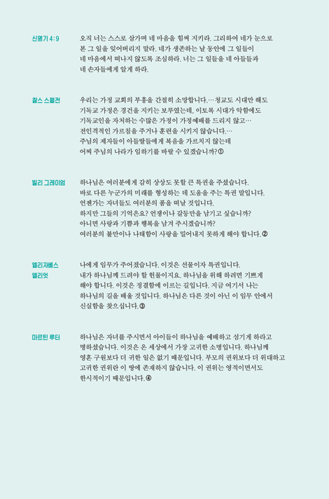 아이를 키운다는 것은 짙은 안개 속으로 들어서는 일과 같다. 갈피를 잡을 수 없는 두려움 탓에 다들 ‘생존’ 모드를 선택하며, 잠자리에 들 때까지 버틴 것만으로도 성공한 것이라 여기며 살아간다. 하지만 우리네 허탈한 마음은 이미 알고 있다. 살아남는 것을 넘어선 무언가가 필요하다는 것을 말이다. 하루하루 꾸역꾸역 견디며 사는 걸 삶이라 말할 수 있을까? 생존에 목매는 하루가 쌓여 몇 주, 몇 달, 몇 해가 된다. 아이가 믿음으로 성장할 기회들은 길가에 떨어진 씨처럼 널브러지고, 우리는 그 길을 무심히 걸어간다. 그리스도인 부모라면 한창 자라는 내 아이의 현명한 청지기가 되고 싶기 마련이다. 시편 90:12은 이렇게 말한다. “우리에게 우리 날 계수함을 가르치사 지혜로운 마음을 얻게 하소서.” 우리는 이 귀한 날을 잘 계수하는 사람이 되고 싶다.