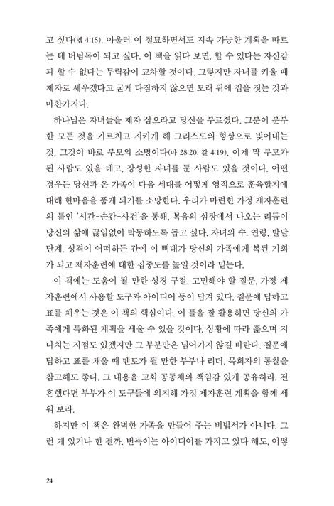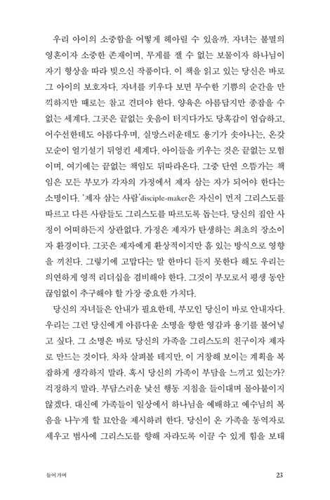 당신의 자녀들은 안내가 필요한데, 부모인 당신이 바로 안내자다. 우리는 그런 당신에게 아름다운 소명을 향한 영감과 용기를 불어넣고 싶다. 그 소명은 바로 당신의 가족을 그리스도의 친구이자 제자로 만드는 것이다. 차차 살펴볼 테지만, 이 거창해 보이는 계획을 복잡하게 생각하지 말라. 혹시 당신의 가족이 부담을 느끼고 있는가? 걱정하지 말라. 부담스러운 낯선 행동 지침을 들이대며 몰아붙이지 않겠다. 대신에 가족들이 일상에서 하나님을 예배하고 예수님의 복음을 나누게 할 묘안을 제시하려 한다. 당신이 온 가족을 동역자로 세우고 범사에 그리스도를 향해 자라도록 이끌 수 있게 힘을 보태고 싶다(엡 4:15). 아울러 이 절묘하면서도 지속 가능한 계획을 따르는 데 버팀목이 되고 싶다. 이 책을 읽다 보면, 할 수 있다는 자신감과 할 수 없다는 무력감이 교차할 것이다. 그렇지만 자녀를 키울 때 제자로 세우겠다고 굳게 다짐하지 않으면 모래 위에 집을 짓는 것과 마찬가지다.