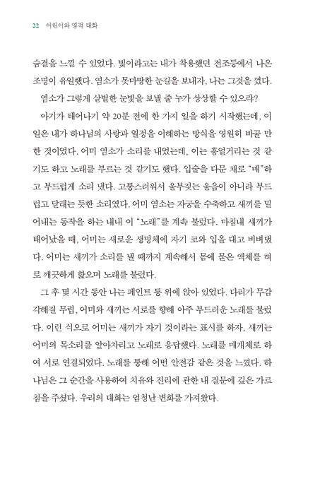 하나님이나 종교적 전통에 대한 어린이의 경험을 가정할 때, 많은 것을 나눌 수 없다. 나는 어린이가 주도적으로 대화를 이끌 수 있도록 더 넓은 공간을 만드는 법을 배웠다. 대신, 우리는 그의 삶에서 선하고 아름답고 진실한 것에 주의를 기울였다. 우리는 다른 사람들의 친절에 주목했고, 그에게 있는 고통의 일부를 밝히고 풀어 주었다. 그는 3주 동안 헤이븐 하우스에만 있다가 사라졌다. 세 번 만났고, 하나님에 대한 언급은 없었지만, 하나님은 분명히 그곳에 계셨다. 듣고, 눈물을 흘리며, 연약한 순간에 하나님은 그의 고통과 분노를 듣고 인정하셨다. -pp. 176-177