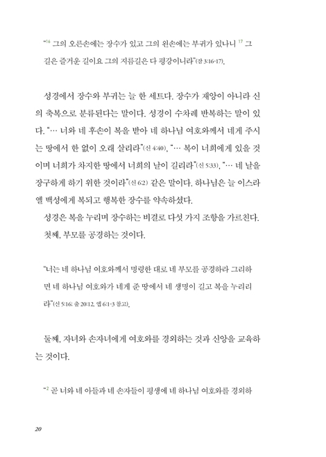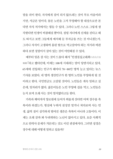 예수님은 “묵은 포도주를 마시고 새것을 원하는 자가 없나니 이는 묵은 것이 좋다 함이니라”(눅 5:39)라고 하셨다. 쓸모 있는 연장은 버림받지 않는다. 욥기 5장 7절에 “사람은 고생(trouble)을 위하여 났으니”라고 말한다. 유대인들은 이 말을 “사람은 일하기 위해 났으니”라고 해석한다. 뒷방 노인이 아니라 누군가 다른 사람을 돌보고 있다는 것은 생산적으로 일한다는 말이다. 자녀에게 도움주는 입장에 서면 도움을 받을 때보다 떳떳하고 당당하다. 하나님이 노인들에게 손자녀를 교육하라고 명령한 것은 늙어서도 도움을 주는 사람으로 떳떳하고 당당하게 살라는 의미일 것이다. – 32~33쪽