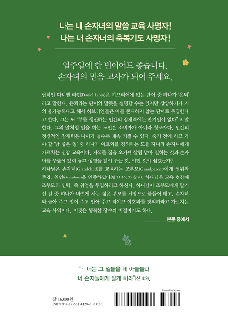 생각만 해도 활력 넘치는 노후의 모습 아닌가. 하루 아홉 시간씩 손주들 수발 들라는 것이 아니다. 하루에 4시간, 아니 일주일에 한 번만이라도 손주에게 말씀을 가르치는 선생이 되어 달라는 것이다. 누구보다도 열정적으로 말씀을 사모했던 그 모습, 평생에 걸쳐 하나님이 함께하셨던 간증들, 말씀과 삶을 통해 깨닫게 해 주신 지혜를 아낌없이 손주들에게 전수해 달라는 것이다. 랍비인 다니엘 라핀 (Daniel Lapin )은 히브리어에 없는 단어 중 하나가 ‘은퇴’라고 말한다. 인간의 정신적인 잠재력은 나이가 들수록 계속 커질 수 있다. 죽기 전에 하고 가야 할 ‘남 좋은 일’ 중 하나가 여호와를 경외하는 도를 자녀와 손자녀에게 가르치는 신앙 교육이다. 하나님은 손자녀 (Grandchild)를 교육하는 조부모 (Grandparent) 에게 권위와 존경, 위엄 (Grandeur )을 인증하셨다(민 11:16, 25 참고). 하나님은 교육 현장에 조부모의 인력, 즉 위엄을 투입하라고 하신다. 이 책은 조부모들이 당당하게 지혜롭게 대대손손 신앙을 전수할 수 있도록 친절하게 돕는 데 탁월하다. ‘쓸모 없다, 소망 없다, 자식에게 폐만 될 뿐이다’ 라고 생각하는 많은 조부모님이 이 책을 도움삼아 윤기 나는 보람찬 노년의 삶을 영위하길 바란다.