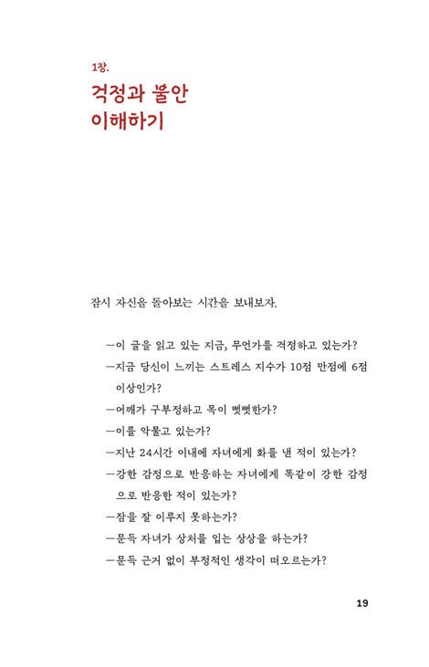 이 책은 불안으로 인한 스트레스 상황에서 몸과 정신, 마음에 실제로 적용해볼 수 있는 여러 방법을 제시한다. 먼저 불안이 부모와 자녀에게 영향을 미치는 메커니즘을 이해하는 것이 중요하다. 불안이 우리 뇌를 지배하면, 우리 몸은 통제 불능 상태가 된다. 그래서 현재에 집중하게 해주는 여러 방법을 통해 이성을 되찾는 것이 중요하다. 또 한 번 자리 잡은 부정적인 생각은 롤러코스터처럼 머릿속을 빙빙 돌며 더욱 증폭된다. 그래서 부정적인 생각이 완전히 자리하기 전에 그것에 이름을 붙이고, 반박하여 몰아내야 한다. 불안한 상태에서는 상황이 확실하기를 바라기 때문에, 자녀를 통제하게 되거나 그 상황에서 도망치게 된다. 그래서 자기감정을 솔직히 나누고 두려움에 맞서는 것이 중요하다.