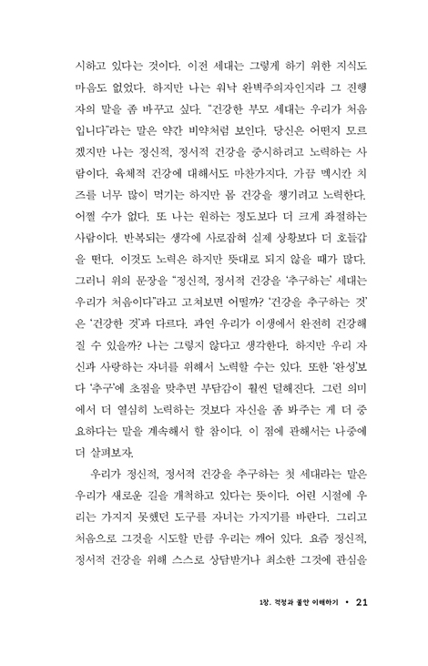 불안은 치료하지 않고 방치하면 상황을 더 악화한다. 걱정도 마찬가지다. 걱정하는 신경 경로가 더 강해져서, 실제로 경험하기보다는 걱정하는 데 더 많은 시간을 허비하게 된다. 자신감을 느끼고 용기를 낼 때보다 불안을 느낄 때가 더 많아진다. 걱정과 불안을 몰아내기 위한 방법은 간단하다. 싸워야 한다. 모든 영역에서 싸움을 벌여야 한다. 이것이 이 책이 몸과 정신과 마음, 이렇게 세 가지 영역에 관한 실질적인 도구를 제시하는 이유다. 걱정은 이 세 가지의 모든 영역에서 우리를 무너뜨리려고 한다. 따라서 우리는 이 모든 영역에서 싸움을 해야 한다.