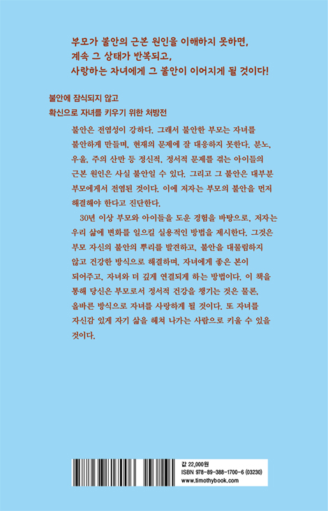 자녀를 키우며 불안을 느끼는 것은 그만큼 자녀를 사랑하고 아끼기 때문에다. 이 책은 불안의 거짓말에 속아 넘어가지 않고, 우리 눈을 신실하신 하나님께 맞추도록 도울 것이다. 그래서 부모로서 정서적 건강을 챙길 수 있게 되는 것은 물론, 올바른 방식으로 자녀를 사랑하게 될 것이다. 또 자녀를 자신감 있게 자기 삶을 헤쳐 나가는 사람으로 키울 수 있을 것이다.