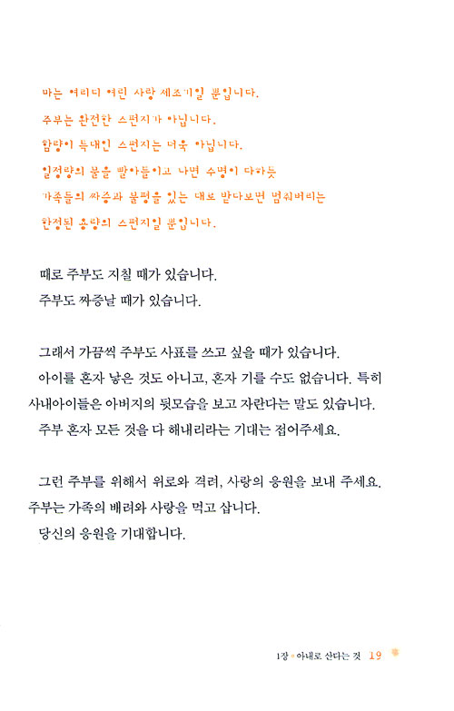 그러면서 저자는 무조건적인 요청보다는 남편의 아내를 사랑하는 마음을 잊지 않고 두고두고 회상하면서 누가 뭐라 해도 당신이 최고라는 남편에 대한 존경과 사랑을 잊지 않는다. 남편에게 힘이 되는 따뜻한 말을 통해서 남편 또한 가정의 머리로 힘들게 살아가는 어려움을 위로받을 것이다.
