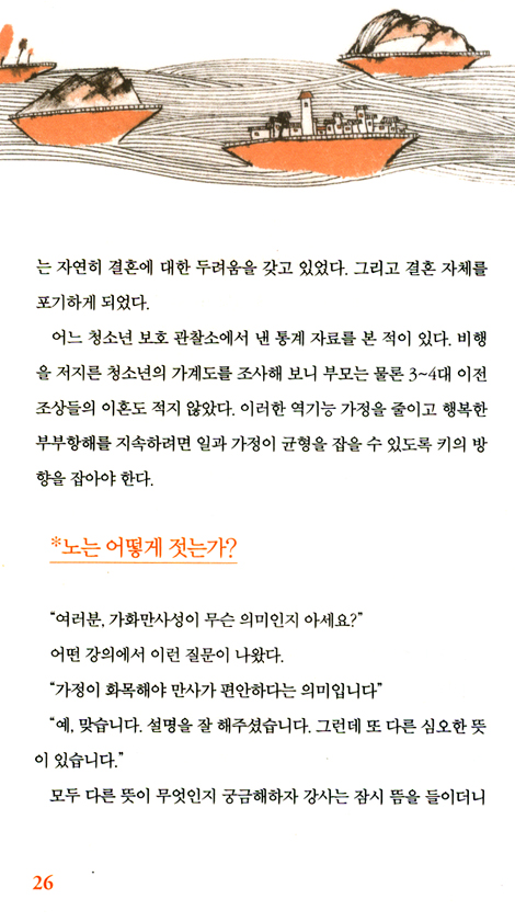 흘러가는 삶 속에서 부부라는 배의 돛을 올리며 항해 할 때 가장 주요한 항해 수칙은 ‘사랑은 감정이 아닌 의지’라는 것이다. 행복을 선택하겠다는 의지가 결국은 부부 갈등을 최소화하면서 건강한 사회 기본 단위인 가정을 건강하게 만들 수 있다고 누누이 조언하고 있다.