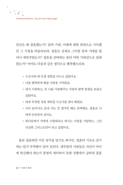 이대로 평생 행복하기만 할 것 같았던 결혼생활이 삐걱거리기 시작하면, 당황스럽고 답답하여 혼자서만 끙끙 앓는다. 아무리 가진 것 많고 부족함이 없더라도 마음과 마음이 이어지는 영혼의 대화가 불가능하면, 부부는 결혼관계에서 생명력을 얻지 못한다. 말이 통하지 않는 관계에는 행복이 깃들지 않는다.