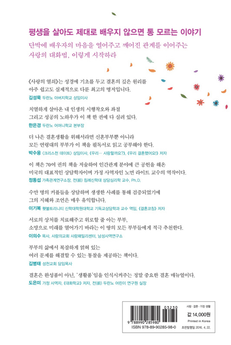 결혼과 가정, 가족 관계 분야의 전문치료사인 노먼 라이트는 40여 년간 수만 명의 커플을 직접 만나 대화하고 그들의 회복을 돕는 과정에서, 오랜 시간 행복하게 살아가는 커플들의 공통점을 정리했다. 저자에 따르면 행복한 커플은 갈등이 없는 관계가 아니라 모든 문제를 대화로 풀어가는 관계다.