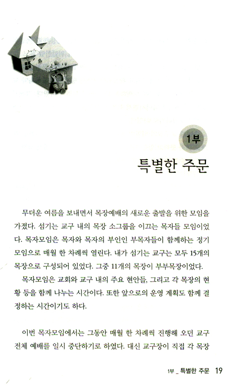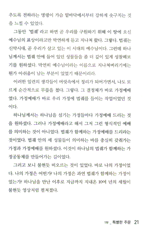 1부에서, 저자의 가정을 향하신 하나님의 특별한 주문과 신앙고백, 신앙성장 스토리를