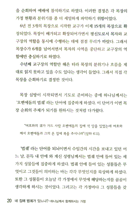이 책은 단 3개월 동안 하나님의 법궤를 모셨을 뿐인 오벧에돔의 온 집을 복 주셨던 하나님께서‘오벧에돔의 법궤’라는 단어에서 모티브를 발견, 가정공동체를 향한 하나님의 뜻에 대해 이야기한다.
