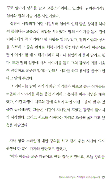 교회에서는 단란해 보이는 크리스천 가정도 그 속을 들여다보면 자녀 교육의 기본이 무너져 있는 경우를 자주 보게 된다. 문제는 부모가 자신의 가정이나 자녀 교육의 문제점을 잘 모르고 있다는 것이다. 이 책은 그런 부모들에게 자녀 양육의 원칙을 제공하는 훌륭한 지침서다. 부모의 양육 스타일부터 정서적 · 영적 · 도덕적 훈련에 이르기까지 자녀들을 성숙하게 키울 수 있는 노하우를 총체적으로 담아냈기 때문이다.
