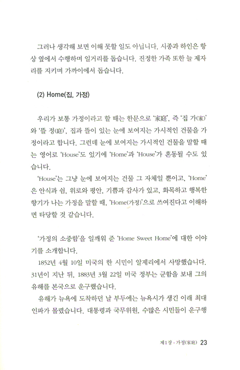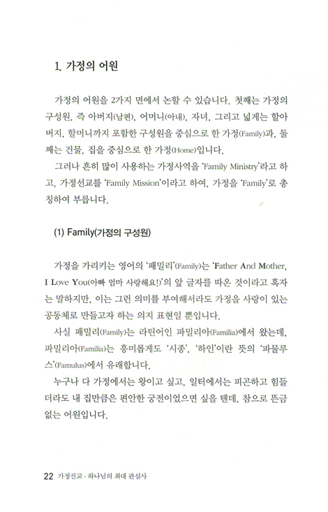 가정불화와 가정폭력 등 가정에서 일어나는 크고 작은 여러 가지 문제들로 인해 사회가 어지러운 것을 본 저자는 성경적, 선교적 차원에서 가정을 바로 세우고자 하는 사명감에 2007년부터 7년 동안 크리스천 신문에 연재해 온 가정선교 칼럼을 엮었다. 가정선교는 모든 가정의 문제를 해결하는 열쇠이며 시작점인 동시에 세계선교의 출발지이며 도착지다. 신학교에서 상담학과 가정사역을 전공하고 박사학위를 받은 저자는 성경적 가정사역으로 가정문제를 해결해야 한다고 주장하며, 부록에서는 <남편의 규범>, <아내의 규범>, <부부싸움의 도(道)>를 통해 가정문제의 실제적인 해결방안을 제시한다.