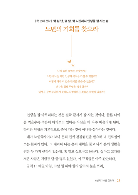 35년 전, 우리가 어떻게 생명을 연장시킬지에 관한 ‘지식’만 많고 언제 생명을 연장시켜야 할지에 관한 ‘지혜’는 부족하다는 말을 들은 적이 있다. 당시도 그랬지만 지금은 훨씬 더 심각한 것 같다. 그렇게 때문에 인생을 잘 마무리하기 위한 일곱 번째 전략이 매우 중요하다. _ 일곱 번째 전략. 첨단 의학 기술을 적절히 사용하라