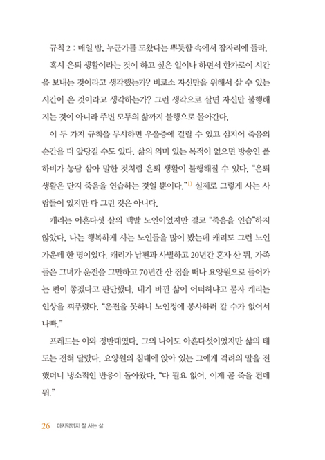 그동안 내가 깨달은 사실 하나는, 잘 죽는 것이 우연인 경우는 별로 없다는 것이다. 그것은 평생에 걸친 선택들이 쌓이고 쌓여서 만들어 내는 결과다. 결국, 잘 죽는 것은 마지막 순간까지 잘 사는 것을 의미한다. 우리 사회에서 자신의 마지막을 일부러 계획하는 사람은 별로 없다. 하지만 오늘날 그런 계획이 그 어느 때보다도 필요하다. _ 들어가는 글