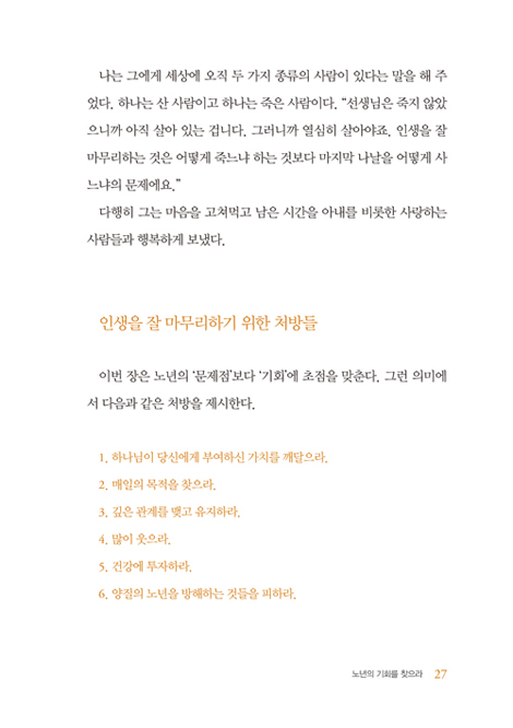 인생의 마지막 정거장을 앞두고 있는 사람은 물론이고 나중에 인생을 잘 마무리하기 위해 미리 준비하려는 사람들에게도 말할 수 없이 큰 도움이 되는 책이다.