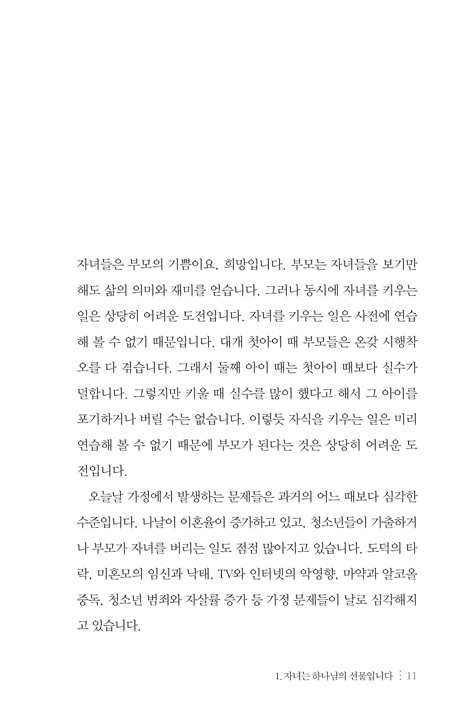 길은 있습니다. 가정을 창조하신 하나님께 방법이 있습니다. 부모와 자녀 사이에 생기는 문제는 하나님의 원리를 따르지 않았을 때 나타납니다. 수많은 가정을 상담해 본 결과, 저는 하나님의 길에서 떠나면 그 즉시 문제가 시작된다는 것을 알았습니다. 설령 문제가 발생하더라도 하나님의 방법으로 돌아오면 아무리 복잡한 문제도 해결되는 것을 보았습니다. 수천 년 된 하나님의 가르침이 최신의 학문적 연구 결과보다 더 확실하다는 것을 알았습니다. 이 책의 원리들을 교과서처럼 배우고 익혀서 실천해 보면, 부모와 자녀의 관계가 좋은 방향으로 새롭게 이뤄질 것이라 믿습니다.