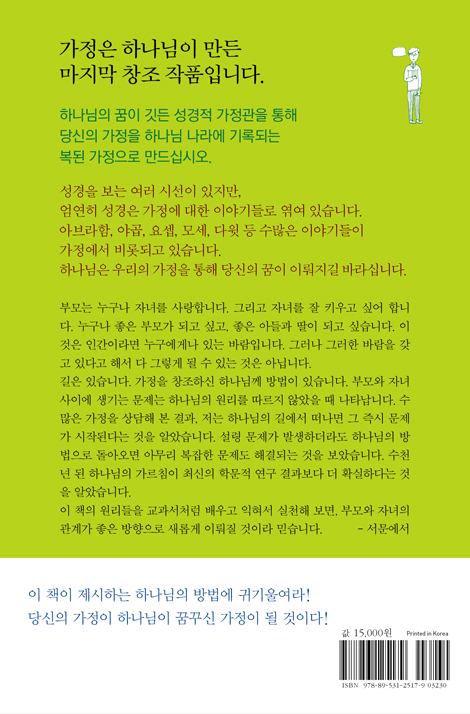 이 책의 뒷부분에서는, 가정에서 일어날 수 있는 여러 가지 문제의 해답을 찾기 위한 노력을 담았습니다. 그리고 부모의 권위와 책임 부분을 논의한 내용은 저의 글이긴 하나, 박광철 목사님의 도움이 들어 있음을 고맙게 생각합니다. 평신도목회연구원과 아세아연합신학대학원과 횃불트리니티신학대학원대학교에서 저와 함께 가정 사역에 대해 공부하신 분들의 좋은 토론과 의견에 대해서도 감사드립니다. 이 땅에 화목한 가정이 많이 나타나서 사회와 국가의 장래가 더욱 밝아지기를 바랍니다.