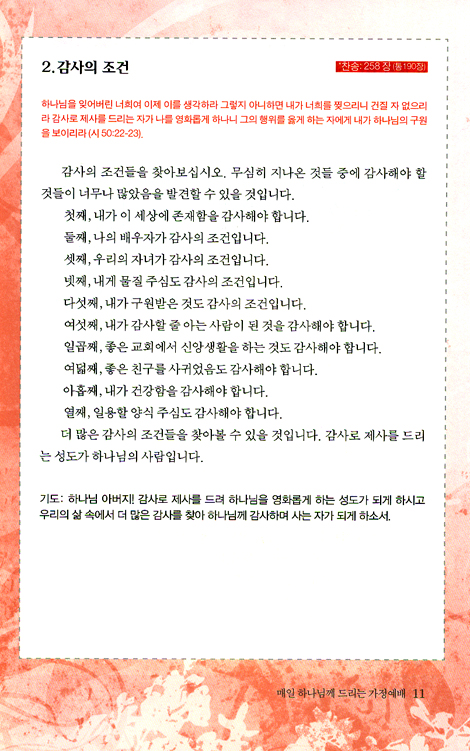 이 귀중한 하루를 주님과 동행하기 위해 사랑하는 가족들과 예배로 시작하시길 기도합니다. 예배를 통해 행복을 가꾸시길 기도합니다. 이 책이 여러분의 가정에 축복의 통로로 나아가는 다리가 되길 소망합니다. 온 가족이 미래를 꿈꾸고 내일을 열어가는 축복의 통로 도우미가 될 수 있기를 기도합니다.