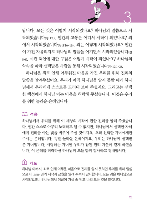 짧지만, 핵심 내용을 담았습니다. 가정 안에서 적용할 수 있는 적용점을 구체적으로 제시합니다. 다함께 짧은 기도문을 읽으며 마음을 드려 삶의 변화를 간구할 수 있습니다.