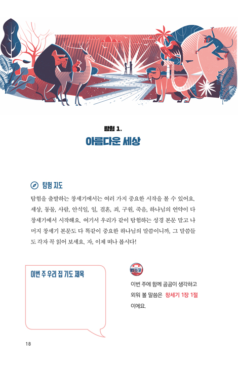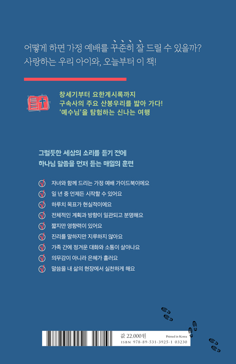 예배하는 우리 집! 부모와 자녀가 함께 떠나는 복음 탐험! 가정 예배를 ‘탐험’으로 만들라. 아이들은 탐험하기를 좋아하니까 성경 읽기를 마치 탐험가가 미지의 세계를 보는 것처럼 만들라. 하루치 분량은 그날의 성경 본문 읽기, 본문과 관련한 두 가지 질문 묻고 답하기, 꼭 기억해야 할 그날의 메시지 읽기, 그날의 성경 본문 내용으로 기도하기로 구성되어 있다. 일 년 52주 동안 구속사적 관점에서 성경 전체의 큰 그림 속으로 들어가서, 신구약 성경 탐험이 곧 예수님을 탐험하는 것임을 몸소 경험하게 된다. 부모와 자녀가 함께 예수를 중심으로 성경을 읽는 법을 익히고, 세상을 분별하는 성경적 가치관을 갖는 시간! 온 가족이 하나님을 예배하는 예배자로 서다!