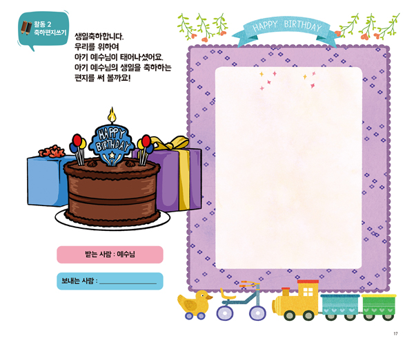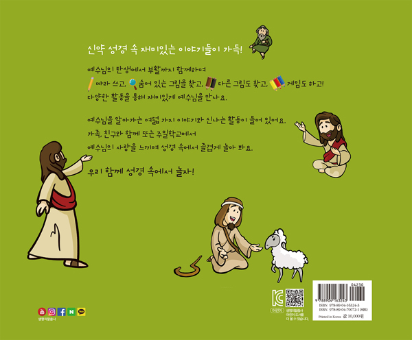 - 색칠, 숨은 그림 찾기, 게임 등이 수록되어 있어 주일학교에서 공과로 활용할 수 있어요.