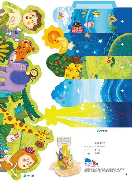 만들기 종이와 만들기 설명서가 책 형식으로 제본되어 만들기 종이를 잃어버릴 염려가 없어요. 책 안에 만들기 종이가 반으로 접혀 제본되어 있답니다. 그리고 제본된 만들기 종이를 책에서 쉽게 떼어 낼 수 있도록 뜯어내기 선이 종이의 안쪽에도 있어요. 뜯는 선을 따라 한 번 접었다 펼친 후 떼어 내면 드르륵 쉽게 떨어진답니다.