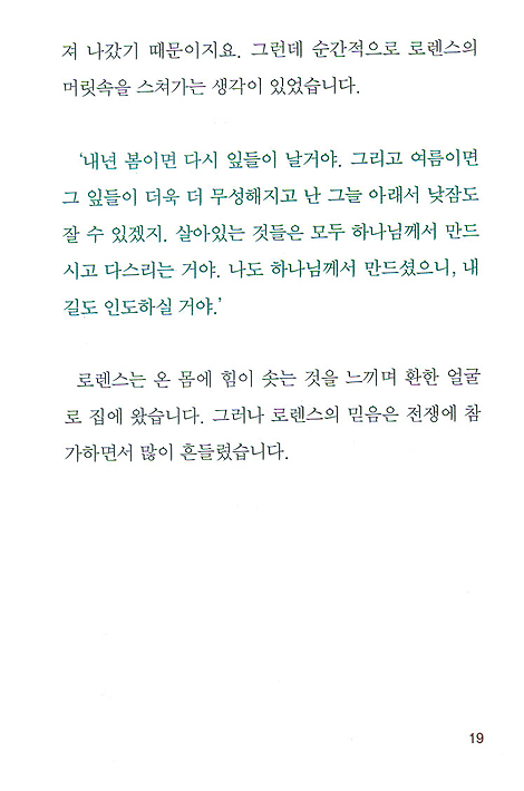 로렌스 형제는 참으로 하나님의 살아계심에 대해 깊이 고민하며 그 방법을 깨달았던 사람입니다. 하나님을 느끼며 살았던 로렌스 형제를 우리들이 만날 수 있다는 사실이 얼마나 감사한 지 모릅니다. 더구나 어린이를 위한 책이 출간되었다는 것은 우리들에게 큰 은혜라 아니할 수 없습니다.