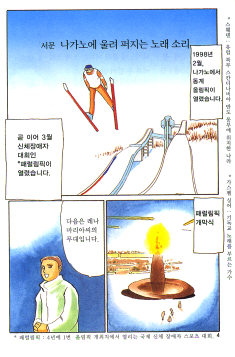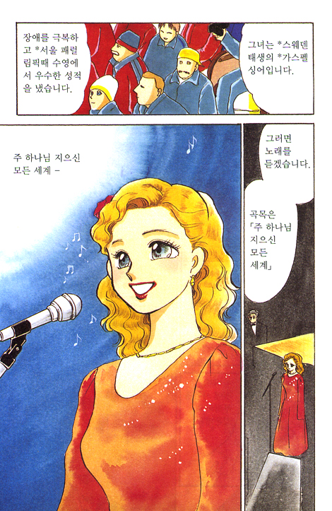 레나 마리아는 1968년 스웨덴에서 두팔이 없고 한 쪽 다리가 짧게 태어났습니다. 그러나 그녀의 부모님은 정상아와 똑같이 사랑으로 그녀를 길렀습니다. 그래서 수영과 십자수, 요리와 피아노, 운전에 이르기까지 레나는 하나밖에 없는 오른 발로 못하는게 없습니다. 3살 때부터 수영을 시작해서 스웨덴 대표로 세계장애자 수영선수권대회에서 4개의 금메달을 땄고, 88년 서울 패럴림픽때도 좋은 성적을 얻었습니다.
