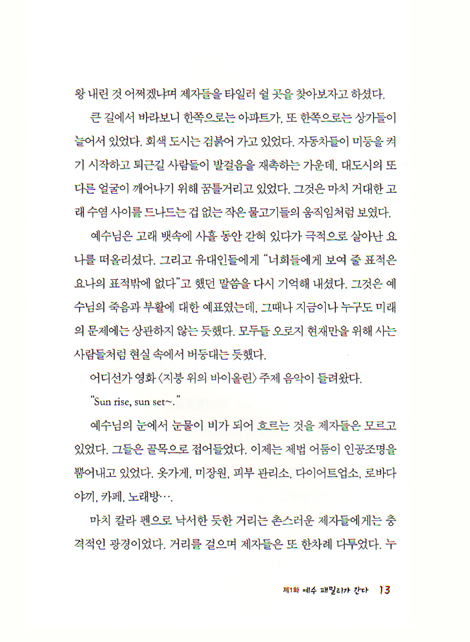 그 다음에 나오는 조연 격 배우 열두제자는 2천 년 전의 사고방식을 그대로 가지고 와서 현대 문명과 사고 방식에 충돌하고 실수를 범하곤 합니다. 그들은 항상 현실에서 부딪히는 문제를 해결하지 못하면 주님을 찾아가서 해답을 요구합니다. 물론 성경에 나오는 열두 제자들을 토대로 해서 그들의 캐릭터를 살리려고 노력했고, 그래서 나름대로 각자에게 어떤 성격과 습관을 부여하여 우리에게 좀 더 친숙하게 다가오도록 했습니다. 여기에 나오는 열두 제자는 성령체험 이후의 변화 받은 제자들이 아니라 변화 받기 이전의 제자들의 모습을 반영한 것입니다. 그리하여 늘 좌충우돌하는 제자들의 모습 속에 우리 자신의 모습을 투영했습니다.